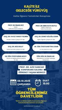 As part of our university's quality initiatives, an event will be held for Quality Student Representatives. The event, titled "Walking to the Future with Quality," will be held at 3:00 PM on October 8, 2025, in the Prof. Dr. Aziz Sancar Conference Hall in the Student Life Center. While participation is mandatory for all unit/department Quality Commission student representatives, all other students are also welcome to participate on a voluntary basis.