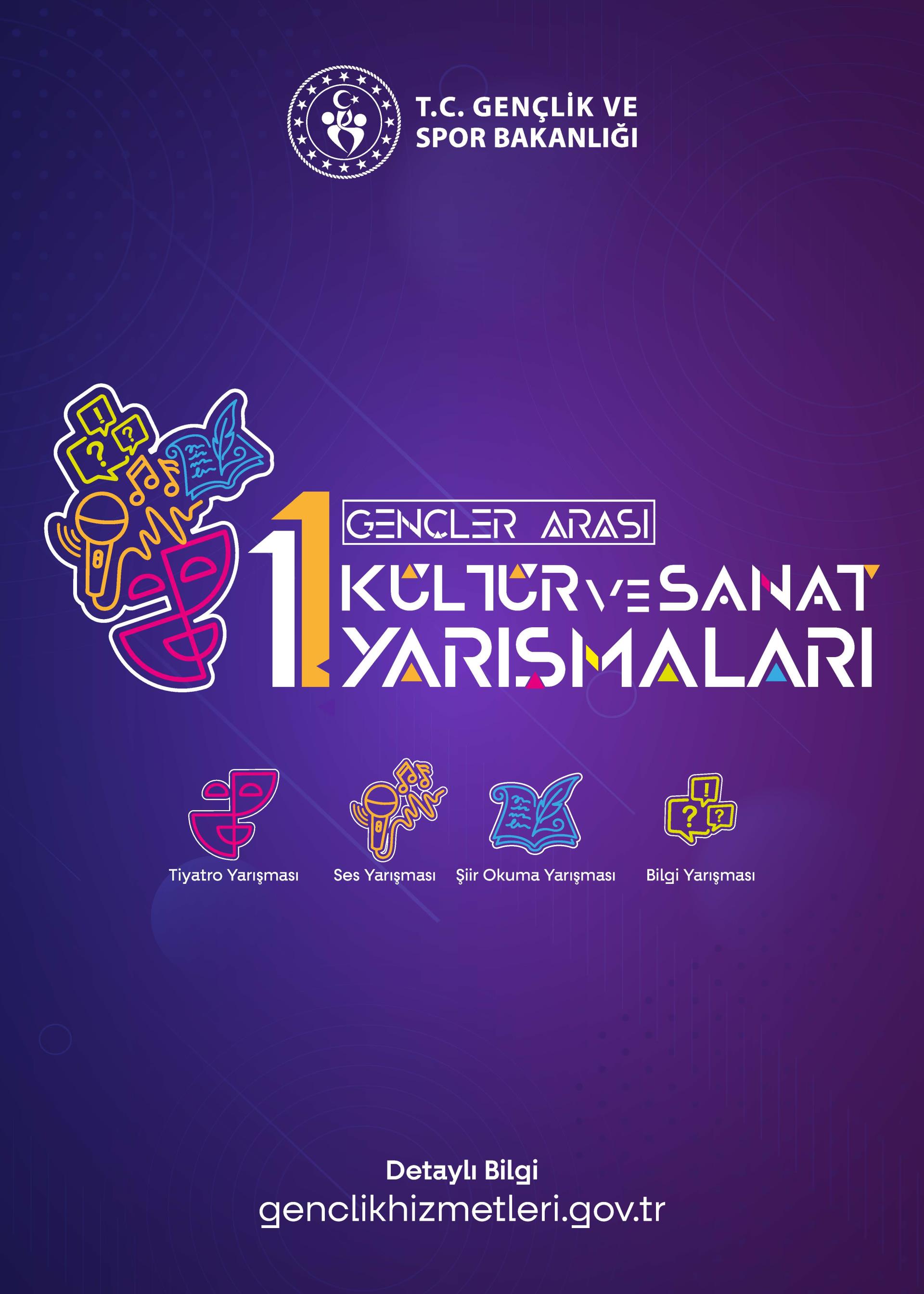 Gençlik ve Spor Bakanlığı Gençlik Hizmetleri Genel Müdürlüğü tarafından, gençlerin geleneksel sanat ve kültürel değerlere yönelimlerini desteklemek, özgüven ve sorumluluk duygularını geliştirmek, topluluk önünde kendilerini sözlü olarak ifade edebilmelerine katkı sunmak ve kültürel mirasımızın genç kuşaklar tarafından daha yakından tanınmasını sağlamak amacıyla “Gençler Arası Kültür ve Sanat Yarışmaları” düzenlenecektir.