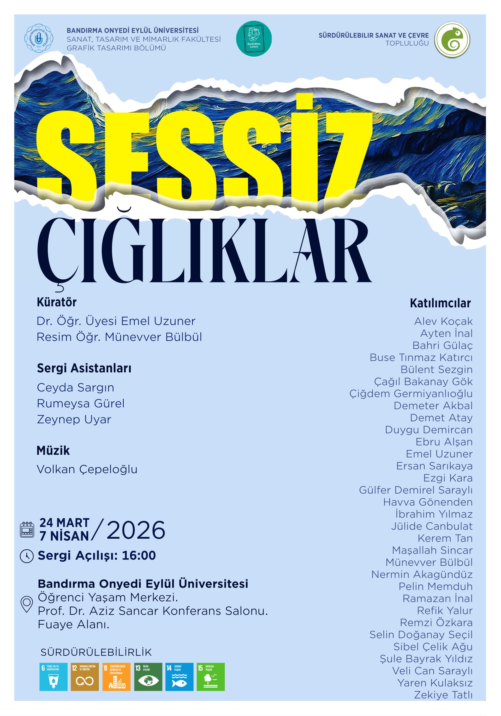 Bandırma Onyedi Eylül Üniversitesi Sanat, Tasarım ve Mimarlık Fakültesi Grafik Tasarımı Bölümü ile Sürdürülebilir Sanat ve Çevre Topluluğu iş birliğinde düzenlenen “Sessiz Çığlıklar” başlıklı sergi, sanatseverlerle buluşmaya hazırlanıyor. Kavramsal çerçevesi ve sanatsal üretim bağlamı itibarıyla güncel tartışmalara katkı sunmayı amaçlayan sergi, kamusal görünürlüğü artırmayı hedeflemektedir.